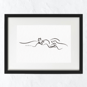 ilustración minimalista Gato, mujer y luna, lámina ilustrada mujer y gato a rayas, ilustración gato y luna llena