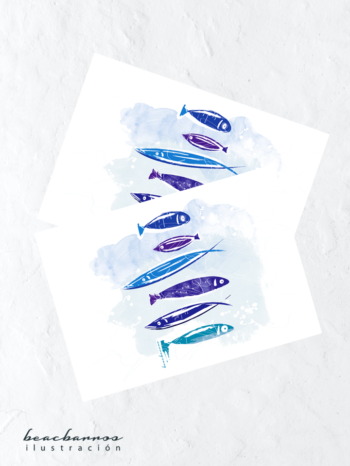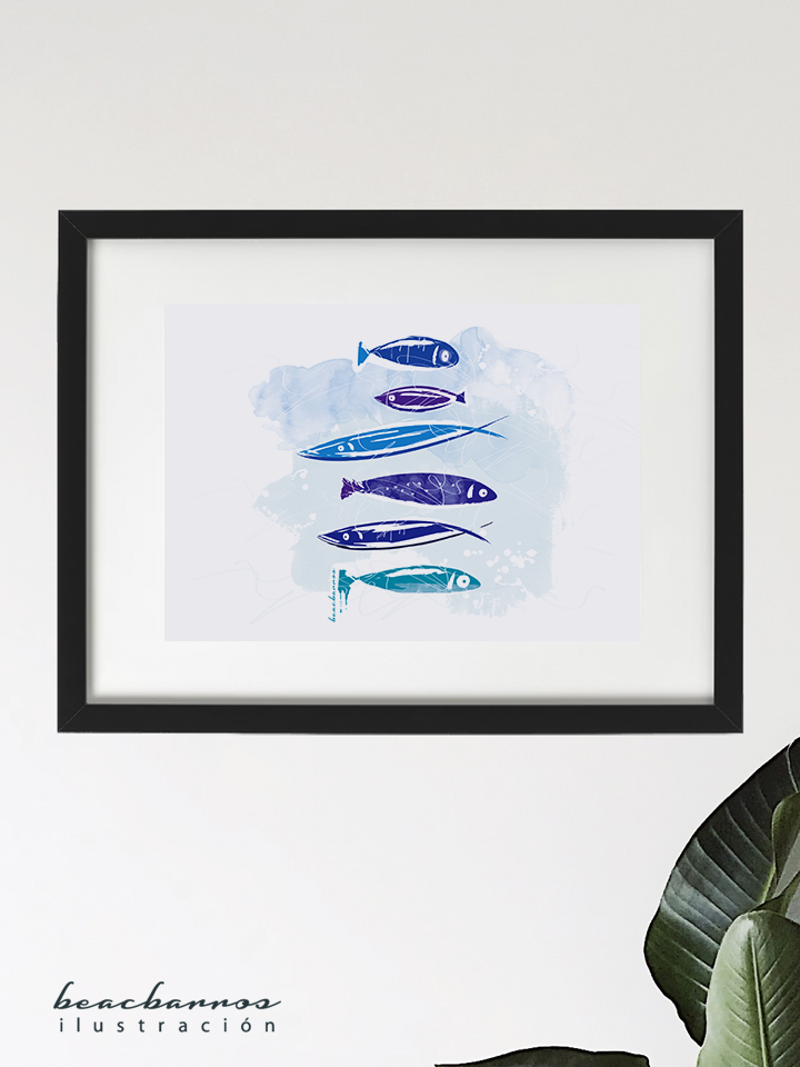 “Peces en la Marina”: colorida y alegre ilustración realizada mediante técnica mixta. Perfecta para decorar con temática marina cualquier espacio.